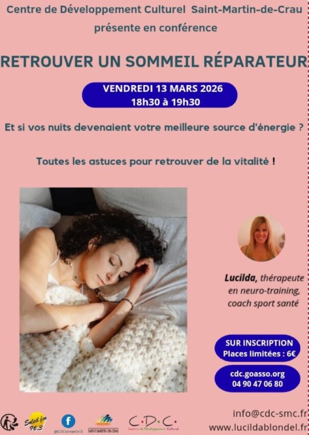 Atelier animé par Lucilda Blondel sur la gestion du sommeil, avec des clés pour retrouver un sommeil réparateur. Elle propose aussi une conférence mensuelle sur des thèmes bien‑être. Tarifs : 6 € par conférence | Pass à l’année 35 €.
