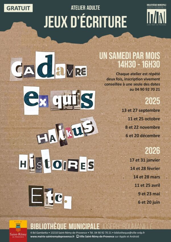 Rendez-vous mensuel, le samedi : chaque atelier est répété deux fois par mois, inscription vivement conseillée à une seule des dates. Atelier adulte, gratuit.