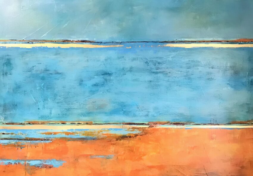 Inspirée par les paysages mouvants de la Camargue, l’artiste propose une peinture entre figuration et abstraction. Matières, lumières et horizons fragmentés composent un univers poétique et méditatif. La feuille d’or, subtilement intégrée, capte la lumière et transforme le regard. Une invitation à la contemplation, au seuil du visible et de l’intime.