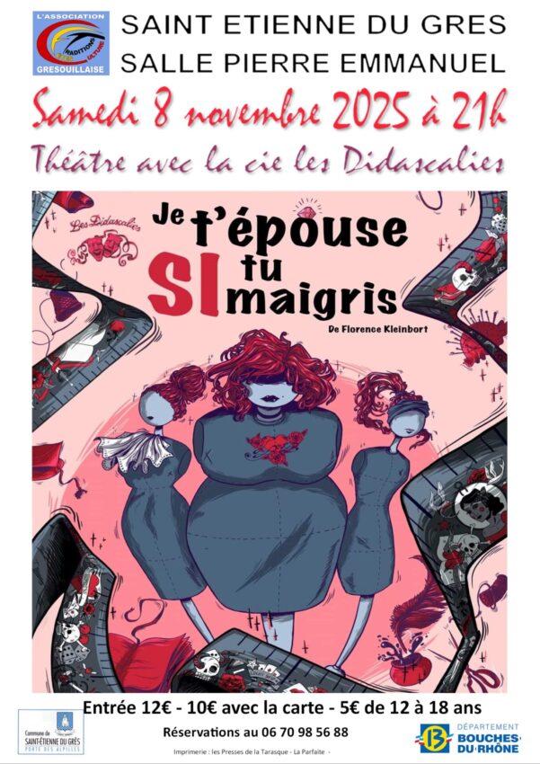 Pièce de théâtre par la Compagnie des Didascalies« Je t’épouse si tu maigris » proposée par l’Association grésouillaise, Culture, fête et traditions. «Venus, Esther et Grâce, trois colocataires aux personnalités et physiques très différents, cohabitent en apparente harmonie, jusqu’à ce que surgissent fragilités, faux-semblants et contradictions. Autour d’elles gravitent Fabio, le voisin styliste exubérant, et Ulysse, frère autiste d’Esther, seul personnage pleinement authentique. Avec humour et dérision, la pièce interroge les diktats sociaux, le poids des apparences et la quête d’acceptation de soi.»